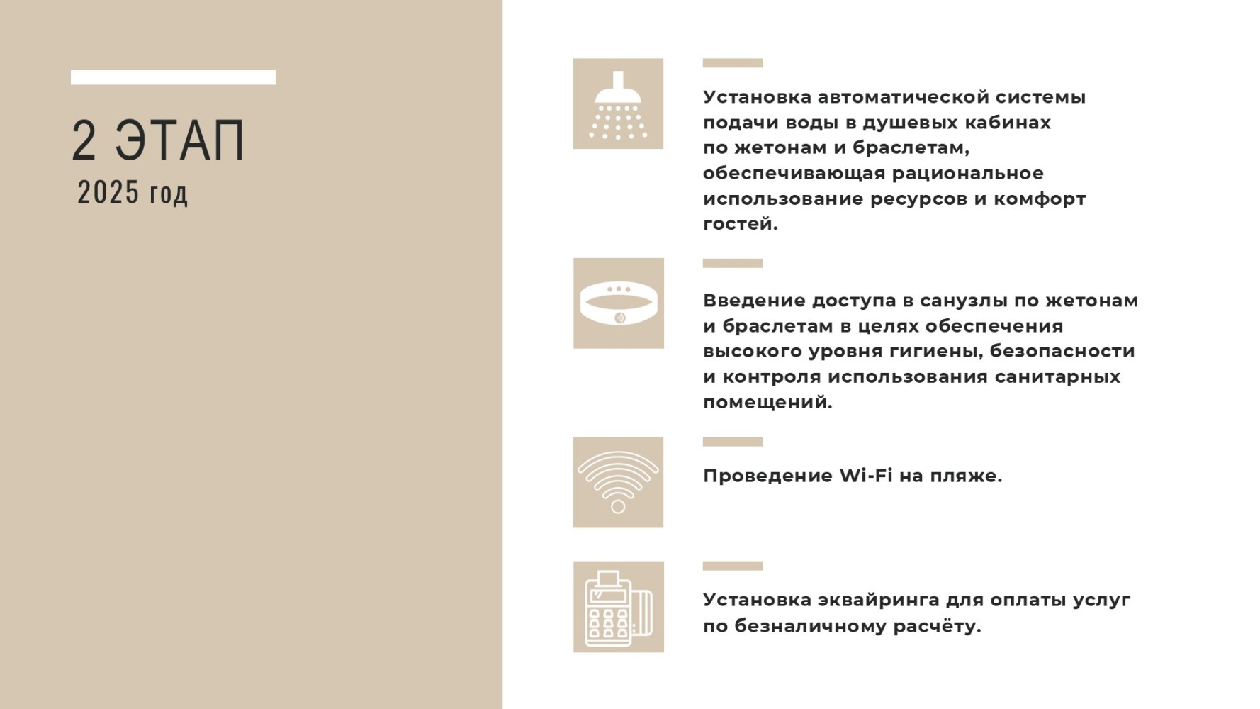 II этап (2025 год) — внедрение новых сервисов, совершенствование удобств и расширение возможностей отдыха.